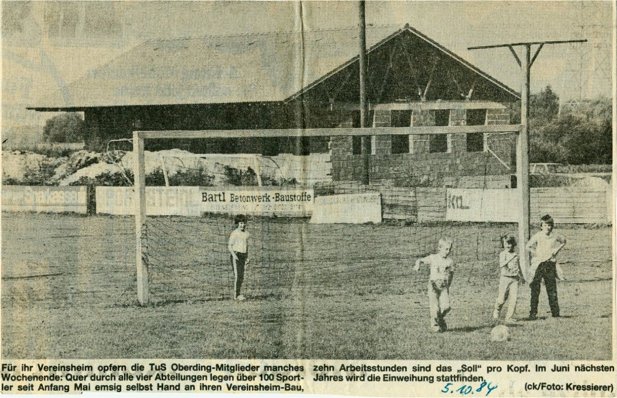Endlich 1984 bekam der TuS Oberding die finanzielle Möglichkeit und auch die Grundstücke, um ein Clubhaus, einen FB-Trainingsplatz sowie 4 Stockbahnen zu erstellen. Die Mitglieder arbeiteten hervorragend mit und machten in 4000 Stunden Eigenleistung mit Ausnahme des Fundaments alles selber.