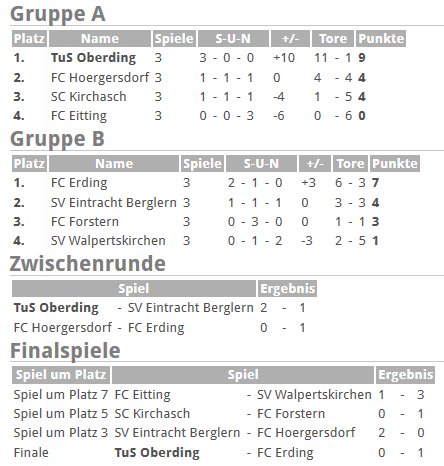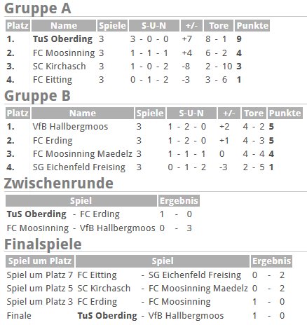 Beim D3-Turnier gewannen die FC Moosinning Mädels durch das abschließende 3:0 gegen die SG Oberding verdient das Turnier, die Schiedsrichter Peter Mende und Daniel Garbrecht leiteten die Spiele. Beim Turnier der C2-Junioren zeigte sich die SG Eitting/Oberding/Schwaig als guter Gastgeber. Verdienter Turniersieger beim von den Schiedsrichtern Simon Hänsel und Robert Götze sicher geleiteten Turniers wurde die SG Eichenfeld Freising mit fünf Siegen und nur einem Unentschieden. Das E2-Turnier schied der Gastgeber unglücklich im Halbfinale aus. Hatte man in der Vorrunde noch alle Spiele gewonnen, gelang im Halbfinale gegen den FC Eitting nur ein 1:1, im Siebenmeterschießen verlor man nur knapp. Die Spiele standen unter der Leitung der Schiedsrichter Matthias Zaschka und Christian Niedermair.