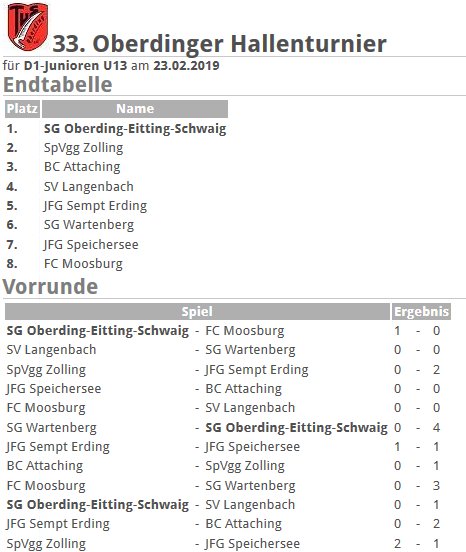 Das 33. Hallenturnier begann mit dem Turnier der A-Junioren. Während sich in der einen Gruppe der TSV Ottobrunn und die JFG Pfaffenhofen durchsetzten, waren in der anderen Gruppe der VfR Garching und die SG Hörlkofen die besten Teams. Der Gastgeber SG Schwaig/Oberding/Eitting landete nur auf dem vorletzten Platz, da er im Siebenmeterschießen gegen die SG Lengdorf knapp unterlag, dann aber gegen den SC Inhauser Moos mit 3:2 die Oberhand behielt. Platz 3 sicherte sich die JFG Pfaffenhofen im Siebenmeterschießen gegen Garching. Turniersieger wurde die schlussendlich die beste Mannschaft, die SG Hörlkofen, welche gegen den TSV Ottobrunn mit 2:0 gewann. Die Schiedsrichter Julian Neumann, Florian Neubert und Christian Trompke leiteten die teilweise harten Spiele souverän.