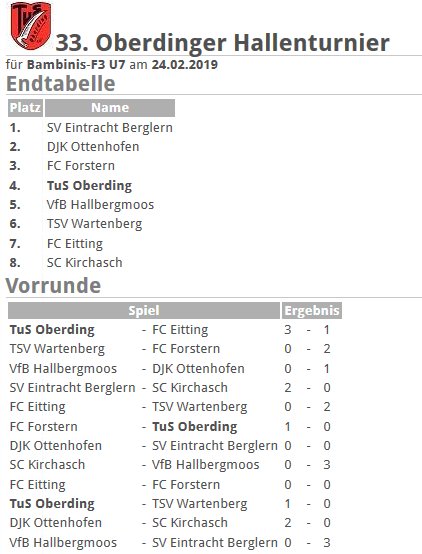 im Turnier der kleinsten Nachwuchskicker war die Halle sehr gut gefüllt. Die DJK Ottenhofen zog erst nach Siebenmeterschießen ins Finale ein, während der SV Berglern knapp gegen den TuS Oberding die Oberhand behielt. Hallbergmoos sicherte sich auch erst im Siebenmeterschießen den siebten Platz. Der TuS Oberding wurde beim von den Schiedsrichtern Matthias Zaschka und Franz Gallistl geleiteten Turnier den vierten Platz. Turniersieger wurde der SV Eintracht Berglern. Der TuS konnte sich neben Chef Hubert Merklein auf eine Vielzahl an Helfern verlassen und freut sich schon auf die 34. Auflage des Turniers