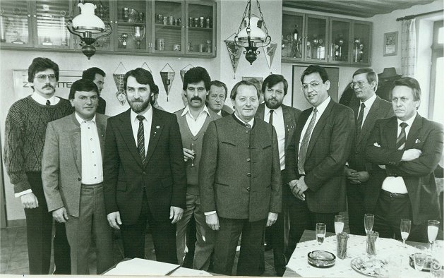 (von links) 1. Vorsitzender Michael Georg, BLSV-Kreisvorsitzender Herbert Knur, Berthold Siegmund, Wilhelm Sepp, Anton Neumair, Gottfried Sepp, 2. Vorsitzender Hans-Joachim Magura, 1. Bürgermeister Franz Schweiger