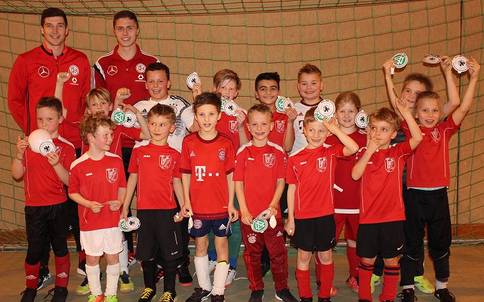 Die U10 des TuS Oberding wurde mit schicken, neuen Trainingsjacken ausgestattet. Gesponsort wurden diese von Michael Riedl - gleichzeitig auch Co-Trainer des Teams - von der Versicherungsagentur "die Bayerische" mit Sitz in Hallbergmoos. Die Jacken wurden auch prompt mit einem souveränem Turniersieg beim SV Palzing eingeweiht . Auf dem Bild: (hinten v.l.) Sponsor und Co-Trainer Michael Riedl, Elias Veladzic, Kapitän Risto Garbrecht, Felix Kaiser, Gina Krause, Trainer Christian Niedermair (vorne v.l.) Dominik Lobermeier, Bastian Huber, Christian Aigner, Michelle Schulze, Ali-Hady El Katat, Maximilian Riedl