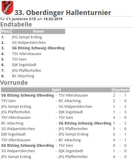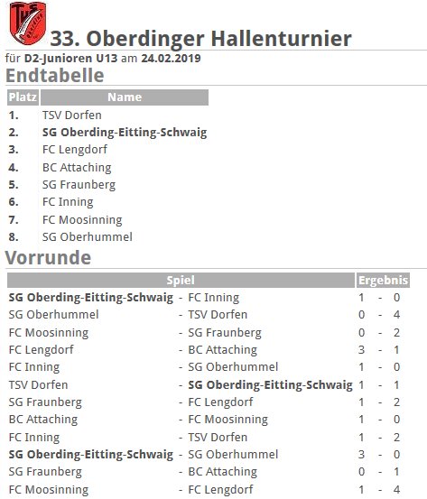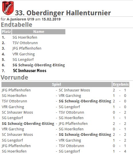 Das 33. Hallenturnier begann mit dem Turnier der A-Junioren. Während sich in der einen Gruppe der TSV Ottobrunn und die JFG Pfaffenhofen durchsetzten, waren in der anderen Gruppe der VfR Garching und die SG Hörlkofen die besten Teams. Der Gastgeber SG Schwaig/Oberding/Eitting landete nur auf dem vorletzten Platz, da er im Siebenmeterschießen gegen die SG Lengdorf knapp unterlag, dann aber gegen den SC Inhauser Moos mit 3:2 die Oberhand behielt. Platz 3 sicherte sich die JFG Pfaffenhofen im Siebenmeterschießen gegen Garching. Turniersieger wurde die schlussendlich die beste Mannschaft, die SG Hörlkofen, welche gegen den TSV Ottobrunn mit 2:0 gewann. Die Schiedsrichter Julian Neumann, Florian Neubert und Christian Trompke leiteten die teilweise harten Spiele souverän.