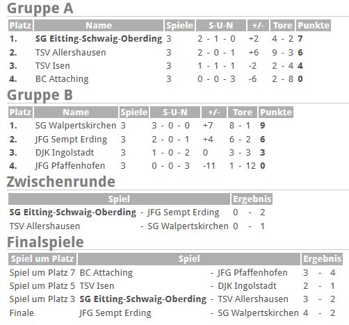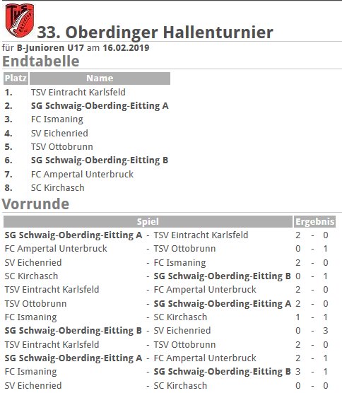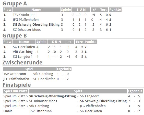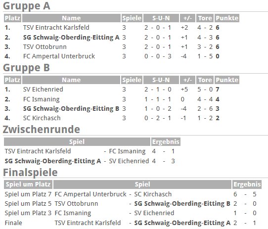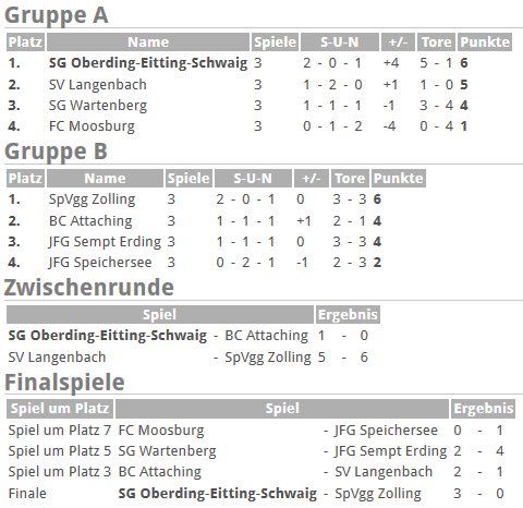 Beim Turnier der B-Junioren musste erstmals eine Sondertabelle erstellt werden; da aber alle drei Teams hier auch gleich waren, entschied die Anzahl der mehr geschossenen Tore für die SG Schwaig A und gegen den TSV Ottobrunn. Die SG Schwaig/Oberding/Eitting A setzte sich überraschend auch im Halbfinale gegen den SV Eichenried im Siebenmeterschießen durch, wobei hier nur die Hälfte der geschossenen Siebenmeter verwandelt wurden. Die SG Schwaig B schlug sich wacker und wurde Sechster. Im Turnier vom souverän leitenden SR-Trio, Hans-Joachim Born, Julian Schaub und Christian Schunke war es im Finale spannend bis zum Schluss. Eintracht Karlsfeld ging in Führung, welche die SG Schwaig ausgleichen konnte. Als alle davon ausgingen, dass die Entscheidung im Siebenmeterschießen erfolgt, traf Karlsfeld nochmals und sicherte sich den Turniersieg
