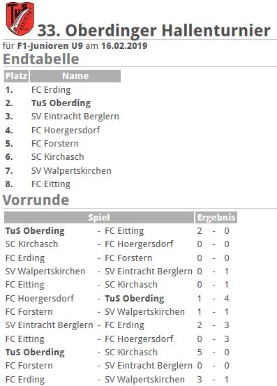 Beim Turnier der F1-Junioren war die Halle erstmals sehr gut gefüllt. Viele Zuschauer sahen, wie sich der TuS Oberding durch die Vorrunde spielte, alle Spiele gewann und 11 Tore schoss. In der Gruppe B setzte sich erwartungsgemäß der FC Erding durch. Diese beiden Teams siegten auch im Halbfinale, wobei der TuS über ein Siebenmeterschießen gehen musste, hier aber mit 2:1 gewann. Die Schiedsrichter Christian Niedermair und Matthias Zaschka hatten bei den fairen Spielen keine Probleme. Im Finale ging der FC Erding früh mit 1:0 in Führung, Danach drängte der TuS mit Mann und Maus auf den Ausgleich, hatte mehrere Einschussmöglichkeiten, gab alles, doch es sollte mit dem ersten Turniersieg beim diesjährigen Hallenturnier nicht klappen.