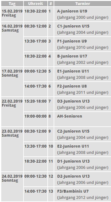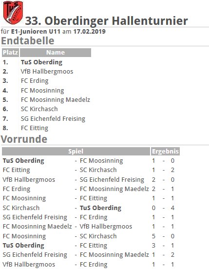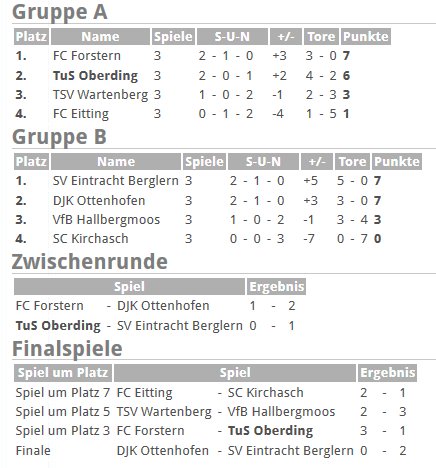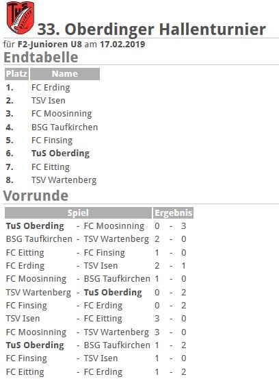 im Turnier der kleinsten Nachwuchskicker war die Halle sehr gut gefüllt. Die DJK Ottenhofen zog erst nach Siebenmeterschießen ins Finale ein, während der SV Berglern knapp gegen den TuS Oberding die Oberhand behielt. Hallbergmoos sicherte sich auch erst im Siebenmeterschießen den siebten Platz. Der TuS Oberding wurde beim von den Schiedsrichtern Matthias Zaschka und Franz Gallistl geleiteten Turnier den vierten Platz. Turniersieger wurde der SV Eintracht Berglern. Der TuS konnte sich neben Chef Hubert Merklein auf eine Vielzahl an Helfern verlassen und freut sich schon auf die 34. Auflage des Turniers
