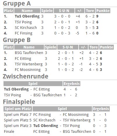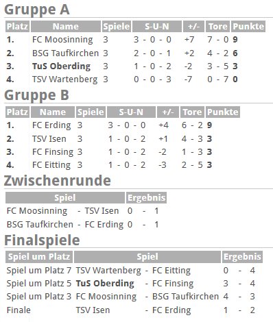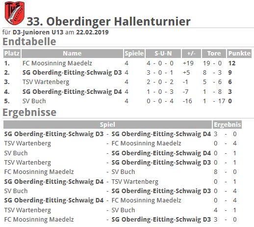 Beim D3-Turnier gewannen die FC Moosinning Mädels durch das abschließende 3:0 gegen die SG Oberding verdient das Turnier, die Schiedsrichter Peter Mende und Daniel Garbrecht leiteten die Spiele. Beim Turnier der C2-Junioren zeigte sich die SG Eitting/Oberding/Schwaig als guter Gastgeber. Verdienter Turniersieger beim von den Schiedsrichtern Simon Hänsel und Robert Götze sicher geleiteten Turniers wurde die SG Eichenfeld Freising mit fünf Siegen und nur einem Unentschieden. Das E2-Turnier schied der Gastgeber unglücklich im Halbfinale aus. Hatte man in der Vorrunde noch alle Spiele gewonnen, gelang im Halbfinale gegen den FC Eitting nur ein 1:1, im Siebenmeterschießen verlor man nur knapp. Die Spiele standen unter der Leitung der Schiedsrichter Matthias Zaschka und Christian Niedermair.