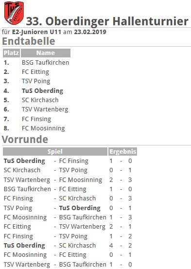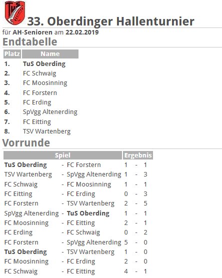 TuS AH-Senioren gewinnen sensationell das Oberdinger Hallenturnier !!!Beim 19. Turnier der Alten Herren, bzw. junggebliebenen Fußballer schoss Andi Reich gegen den starken TuS Oberding den Ausgleich. Durch einen Siebenmeter, verwandelt von Florian Lex; wurde der TuS überraschend Gruppensieger. Im Halbfinale gegen den FC Moosinning hielt TuS-Torwart Andy Stürzer einen umstrittenen Foulsiebenmeter, ehe der TuS, welcher aufopferungsvoll kämpfte, durch Jan Lorenz in Führung ging. Moosinning ließ sich nicht lange bitten und glich durch einen umstrittenen FE von Joe Schmid zum 1:1 aus. Doch Christian Bauer brachte den TuS wieder in Führung. Moosinning hatte die Riesen-Ausgleichschance, doch Stürzer und Jürgen Beck kratzten den Ball noch von der Linie, so dass des beim 2:1 für Oberding und dem überraschenden Finaleinzug blieb. Ein Schuss von Christian Brunner war möglicherweise drin, aber der Ball sprang wieder ins Feld zurück.