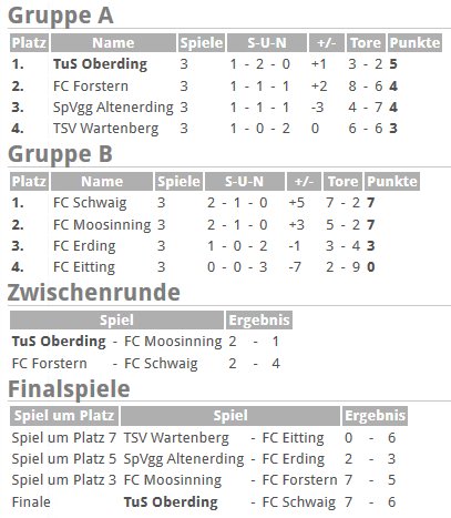 Der Lokalrivale zog souverän ins Finale ein und gewann gegen den FC Forstern mit 4:2. Somit war das Gemeindederby das überraschende Finale, denn niemand hatte den TuS im Finale erwartet,perfekt. Die beiden letzten Begegnungen gingen jeweils ins Siebenmeterschießen. Erst gewann der FC Moosinning gegen den FC Forstern mit 7:5. Dann stieg das Finale. Der TuS Oberding lag schnell mit 0:2 hinten und der FC Schwaig schien den Turniersieg locker einzufahren. Doch der TuS konnte verkürzen und Christian Bauer gelang kurz vor Schluss doch noch der Ausgleich. Sowohl der TuS, als auch der FC Schwaig scheiterten einmal, so dass das Siebenmeterschießen in die Verlängerung ging. Hier traf Olli Schulze für der TuS Oberding, während der FCS vergab, So gewann der TuS das von den Schiedsrichtern Peter Mees, Knut Friedrich und Hans-Joachim Born sensationell das eigene Turnier.