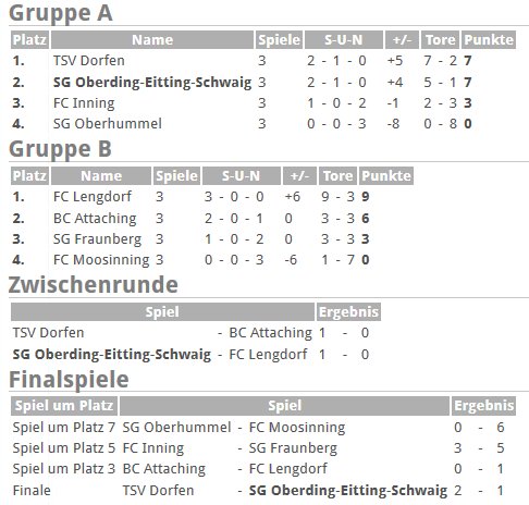 Am letzten Turniertag schoss die SG Oberding im Halbfinale gegen die SG Lengdorf beim D2-Turnier fünfzehn Sekunden vor Schluss das Tor. Lengdorf glich noch aus, aber der Ball überquerte erst nach der Schlusssirene die Torlinie. Der vierte Turniersieg winkte, jedoch erwies sich der TSV Dorfen als zu stark. Schiedsrichter waren Matthias Zaschka und Christian Niedermair.
