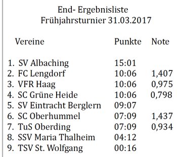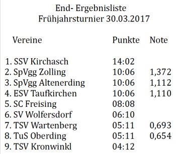 Die weiteren Plätze belegten die Stockschützen Oberding (10:02), die Niederdinger Stockschützen (08:04), die Stockschützen Aufkirchen (05:07), Wilhelm Tell Oberding (04:08), die SKS GmbH Oberding (02:10, Stockquote 0,47) und der FC Schwaig Stockschützen (02:10, 0,40).