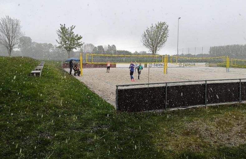 Ein Hauch von Winter lag in der Luft, als gegen Mittag ein heftiger Graupelschauer über die Sandplätze in Oberding zog und die Beachanlage mit weißen Punkten besprenkelte.
