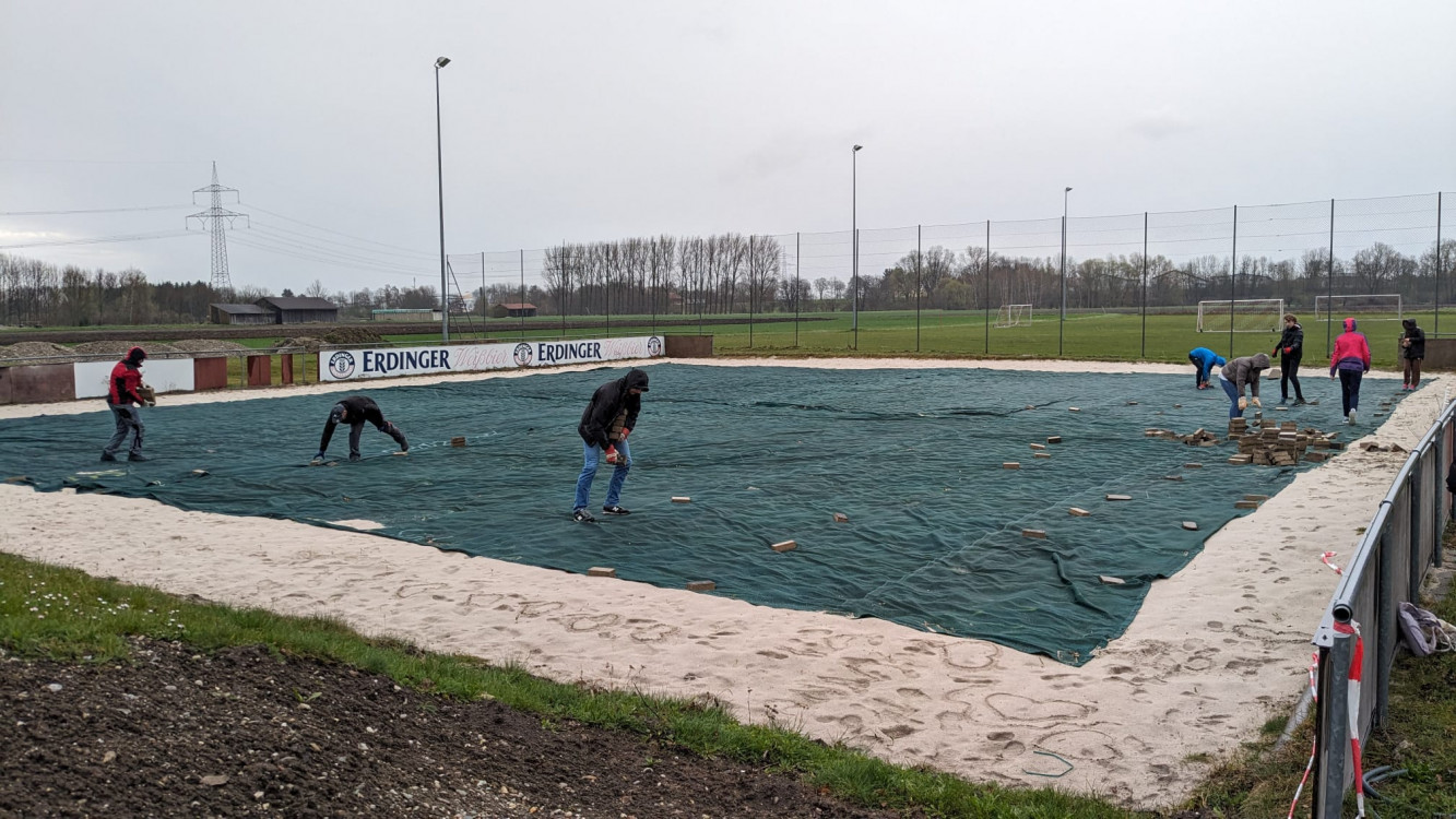 Wie jedes Jahr werden die 4 Plätze wieder aus dem Winterschlaf geholt. Dank zahlreicher helfender Hände ist der Sandkasten für die Sommersaison bereit.
